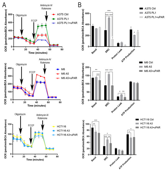 Since the very first description of the receptor for the urokinase plasminogen activator (uPAR) in 1985 [1], a large amount of works have identified the urokinase plasminogen activator system as the mediator of many aspects of cancer cell malignancy, modulating numerous signaling events, cell survival, invasion and migration, angiogenesis and intra-tumor recruitment of inflammatory cells [2,3,4]. As a biomarker in breast cancer, the Plasminogen Activation system is validated for prognostic use in level-of-evidence-1 studies [5]. uPAR over-expression, even in cancer-associated stromal cells, such as cancer-associated fibroblasts (CAFs), is associated with poor prognosis [6]. The integrin-mediated connections of uPAR with many receptor systems, such as receptor-tyrosine-kinases (EGFR, PDGFR), G-protein-coupled receptors and formyl peptide receptor-type 1 [7,8], confers signaling competence to such receptors even in the absence of the relevant specific ligands [9,10]. The classical uPAR-uPA-Plasminogen cell surface cascade, with subsequent extracellular matrix proteolysis, features one of the most important pathways of tumor cells invasion and endothelial cell migration [3,4,11]. Moreover, the role of uPAR in the amoeboid invasion of cancer cells has been recently demonstrated [12]. Given such an abundance of tasks and critical cross-talks, the attempts to control uPAR-mediated multiple functions poses big theoretical and practical problems, such as the privileged inhibition of invasive features that is likely to leave unaltered the signaling properties of the so-called uPAR interactome [4,8]. Our previous efforts, shared by other groups, have pursued the clearing of uPAR from the cell surface by using anti-uPAR ODN (OligoDeoxyNucleotide) [13,14] and miRNA [15], or exploiting uPAR inactivation by specific cleavage systems such as MMP-12 [16] in vitro and in vivo. As a follow-up of our studies, we have used the CRISPR (Clustered Regularly Interspaced Short Palindromic Repeats)/Cas9 technique to obtain the irreversible clearing of uPAR in A375p and A375M6 human melanoma and in HCT116 colon cancer cell lines. This technology, based on a naturally-occurring system that protects bacteria from viral infections [17], is now widely used to manipulate genes in cells and living organisms [18,19,20]. Here we show that the uPAR KO clones have undergone a deep metabolic reprogramming, since the uPAR clearing in melanoma and colon carcinoma cell lines impairs the glycolytic pathway while enhancing the mitochondrial spare respiratory capacity and altering mitochondria biogenesis.