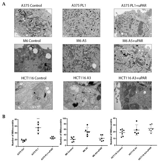 Relying on the OXidative PHOSphorylation (OXPHOS) machinery in the mitochondrial compartment and given the result of the significant upregulation of the SRC in uPAR KO cells, we then examined the control, the uPAR KO and the KO rescued uPAR expression cells ultrastructurally to seek possible mitochondrial alterations (Figure 7A). Despite the noted functional differences, both A375p and A375M6 melanoma cells showed basically similar mitochondria in the different experimental conditions. Only in A375p PL1 cells were elongated mitochondria and autophagic vacuoles with mitochondrial remnants encountered, a feature suggesting increased mitochondrial turnover. We also detected an increased number of mitochondria per cell in the two melanoma cell lines (Figure 7B). On the other hand, colon cancer HCT 116 cells displayed substantial differences; in fact, control cells showed rod-shaped mitochondria with numerous cristae, typical of mature cells, while the HCT116 A3 cells mostly displayed large vesicular mitochondria with a cleared matrix and a reduction of cristae, typical of immature of dysfunctional cells. Of note, these mitochondrial alterations were not detected in the KO cells subjected to rescued uPAR expression.