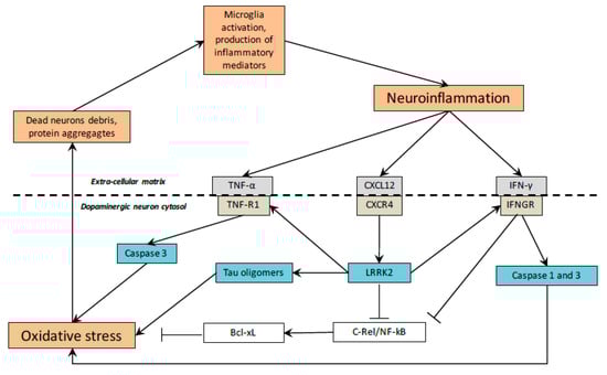| LRRK2 | IL-1, Cox2, NF-kappaB augmentation | Microglia cells | [63] | |