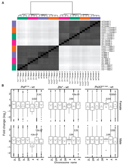 The gender-dependent genome differential analysis shows chromosome-specific alterations within genotypes versus wild type. (A) Samples were clustered and depicted in a heatmap based on Euclidian distances of gene read count RLT (regularised logarithm transformation). Sex is the major sample separator, followed by genotype. (B) Box plots representing expression ratios of whole transcripts (except satellites and transposable elements) for individual chromosome arms and chromosomes 2 and 3 combined (indicated A) in each mutant versus wild type. The box plots display median (line), average (dot), first and third quartiles (box), highest/lowest values within 1.5 × interquartile range (whiskers), and outliers. The statistical significance was determined by the Wilcoxon signed-rank test and p-values are indicated.