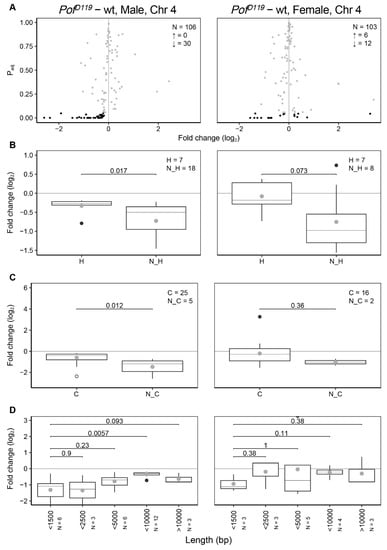 We have previously delineated the relationship between POF and HP1a and the repressive role of HP1a on chromosome 4 genes [16,17,19,59]. We have shown that HP1a preferentially represses long and non-ubiquitously expressed genes along the 4th chromosome. We were therefore interested in studying the more detailed activities of POF as an HP1a concomitant on the 4th chromosome. Dividing the genes on the 4th chromosome into housekeeping and non-housekeeping genes confirms that loss of POF mainly affects non-housekeeping genes (Figure 2B) [11,59]. Next, we divided the genes on the 4th chromosome into either coding or non-coding and compared these two groups. Interestingly, in the absence of POF, the expression of non-coding genes in males shows a stronger reduction compared to coding genes (Figure 2C).