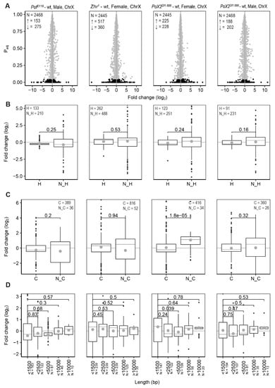 Feature analysis of significant differentially expressed genes on chromosome 4. (A) Differentially expressed genes on the 4th chromosome. N indicates the number of all altered genes, ↑ indicates the number of significant upregulated genes and ↓ indicates the number of significant downregulated genes. The grey dots refer to non-significant changes (Padj > 0.05) and black dots indicate significant changes (Padj < 0.05). (B) Comparison of expression ratios of housekeeping (H) and non-housekeeping (N_H) genes. (C) Comparison of expression ratios of coding (C) and non-coding genes (N_C). (D) Comparison of expression ratios of genes binned according to transcript length (bp) in which the binned transcript lengths represent the ranges 0–1500, 1500–2500, 2500–5000, 5000–10,000, and >10,000 bp, respectively. Only significant altered genes (Padj < 0.05) were included in (B–D). The box plots display median (line), average (dot), first and third quartiles (box), highest/lowest values within 1.5 × interquartile range (whiskers), and outliers. The statistical significance was determined by the Wilcoxon signed-rank test and p-values are indicated.