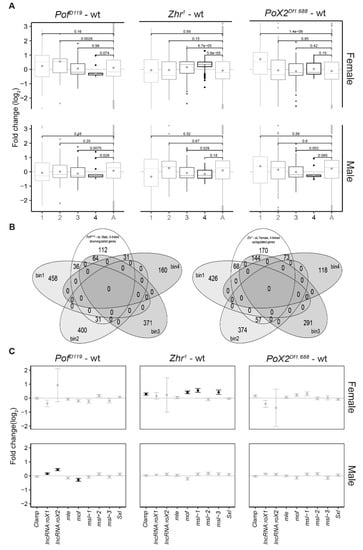 We have previously shown that the euchromatic 1.688PoX2 element promotes specific targeting of POF suggesting that this element retains a targeting function [27]. In wild type, POF exhibits female-specific targeting to a small number of X-chromosome sites—denoted as PoX sites [21]. This targeting is abolished in the PoX2Df1.688 mutant females [27]. Therefore, we included the PoX2Df1.688 mutant that lacks this specific 1.688 satellite repeat on the X-chromosome in our analysis. In PoX2Df1.688 mutant females we observed a small but significant increase in gene expression, both on the X-chromosome and on the 4th chromosome, in comparison with autosomes (Figure 1B, Figure 3, and Supplementary, Figures S1 and S2). However, unlike the pericentromeric 1.688 satellite block, which has no detectable function in male X-chromosome dosage compensation, there was a small but significant reduction in expression of X-linked genes in male PoX2Df1.688 (Figure 1B and Figure 3A). Notably, although the differences in X-expression observed in female and male PoX2Df1.688 mutants are significant, these differences are not accompanied by more genes (in number) being up- or downregulated, respectively (Figure 3A).