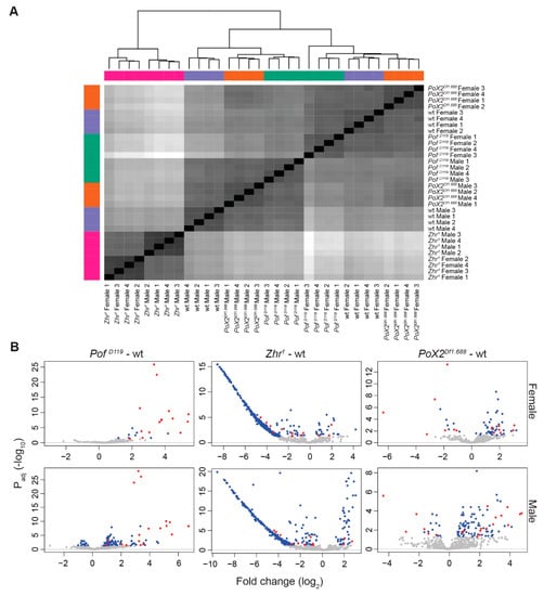 To investigate further the relationship between the 1.688 satellite element and chromosome-specific gene expression, we analysed and compared the genome-wide RNA expression in wild type and PofD119, Zhr1, and PoX2Df1.688 mutants. For this, we sequenced rRNA depleted RNA from adult males and females using an Illumina platform (four biological replicates per genotype). The calculated expression levels thus represent an average of different tissues and cell types. A heatmap of hierarchical clustering based on Euclidian distances produced from the RLT of the read count data showed that the samples were clustered perfectly by gender and genotype (Figure 1A). To find the main chromosome-specific differences between the genotypes, expression ratios for each chromosome were calculated both for the mutants and wild type (Figure 1B). We have previously shown that POF stimulates gene expression from the 4th chromosome [11,16,17,59] and as expected, in the PofD119 mutant, the gene expression on chromosome 4 was significantly decreased in both males and females compared with the other autosomes (Figure 1B, Figure 2A, and Supplementary Figure S1). Importantly, in PofD119 males, a significant decrease in average gene expression (7.68%) of the X-chromosome compared to autosomes was detected (Figure 1B). Of those genes classified as significantly differentially expressed (Padj < 0.05), 275 were downregulated and 153 were upregulated (Figure 3A). Taken together, the results indicate an effect of the PofD119 mutant on male X-chromosome expression.