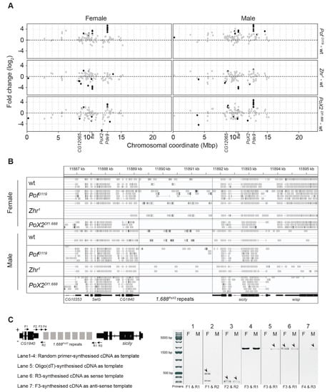 The 1.688 satellite expression analysis across the X-chromosome and at the PoX2 locus. (A) Differential expression and X-chromosome distribution of 1.688 satellite blocks. Dots are coloured black if significant (Padj ≤ 0.05) and grey otherwise. The 1.688PoX2 locus (indicated) is located at approximately 12 Mbp. (B) An Integrative Genomics Viewer screenshot with aligned reads at the PoX2 locus in the different genotypes. Note that no reads map to the 1.688 region between CG1840 and sicily in PoX2Df1.688 mutant females and males. (C) Reverse transcription PCR using the indicated primer combinations confirm the short read-through and long non-coding RNA transcription from the 1.688 satellite at the PoX2 site in wild type. In the gel electrophoresis panel, F and M indicate females and males, respectively.