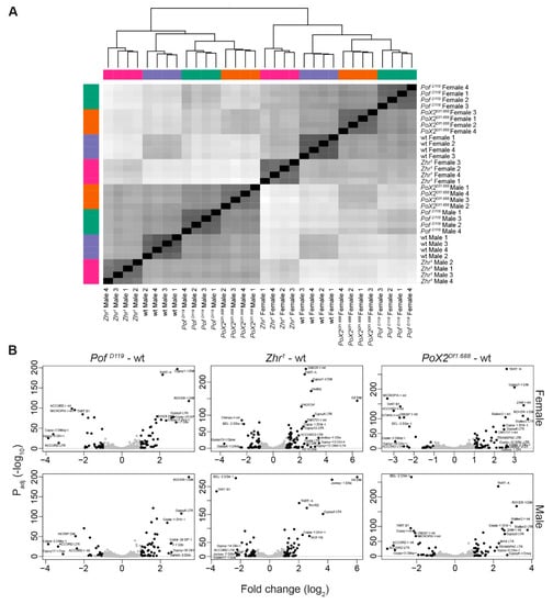 Genome-wide transposon analysis in mutants versus wild type. (A) Sample distance analysis based on RLT read counts of transposons cluster samples by sex and genotype. (B) Volcano plots of differentially expressed transposons. Transposons were predominantly de-repressed in Zhr1 mutants, especially in females. Dots are coloured in black if significant (Padj ≤ 0.05 and up/downregulation log2 fold change ≥ 1), otherwise grey. Labels are shown for black dots which also have up/downregulation log2 fold change ≥ 2. Labels were moved manually to avoid text overlaps and redundant labels were removed.