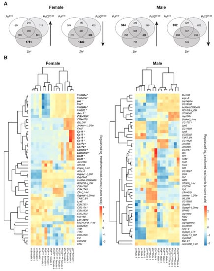 A Gene Ontology enrichment analysis (excluding transposons) showed that most co-upregulated genes in Zhr1 and PoX2Df1.688 female mutants are involved in nucleic acid metabolic process and female gamete generation (Table S2), while the co-downregulated genes in these two mutants were mainly involved in developmental processes (Table S3). Notably, the gene families of Chorion protein and Vitelline membrane were found to have increased expression in Zhr1 females and are among the top 50 most variable transcripts in our analysis (Figure 8B). The main variable transposons, e.g., G6 and Jockey-1 were also found in Zhr1 in both females and males (Figure 8B).