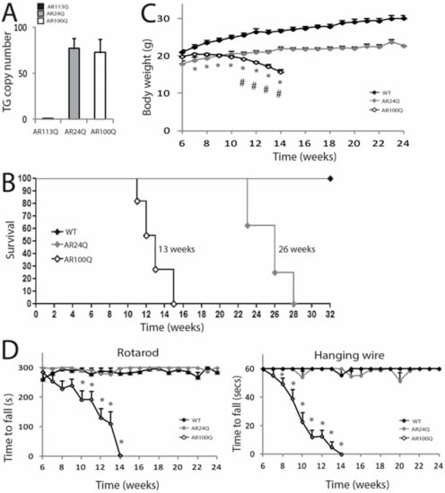 - Abel, A.; Walcott, J.; Woods, J.; Duda, J.; Merry, D.E. Expression of expanded repeat androgen receptor produces neurologic disease in transgenic mice. Hum. Mol. Genet. 2001, 10, 107–116. [Google Scholar] [CrossRef][Green Version]