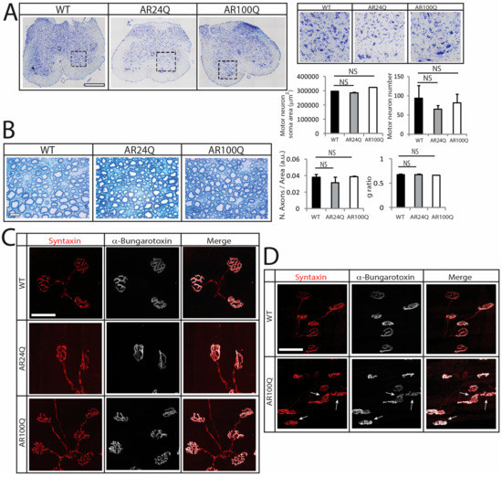 To determine whether alterations of motor function in AR100Q result from abnormalities in the motor unit, we analyzed MN number and soma area, axon, neuromuscular junction (NMJ) and skeletal muscle pathology.