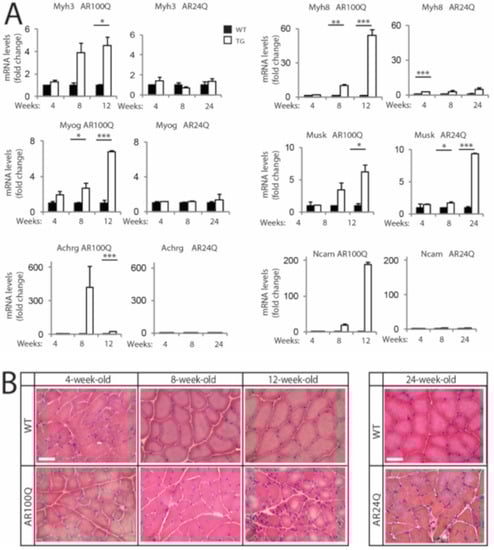 Based on these observations, we assessed whether AR100Q mice develop signs of denervation and myopathy at early (4 weeks), middle (8 weeks) and late stage (12 weeks for AR100Q mice and 24 weeks for AR24Q mice) of disease. We measured the transcript levels of embryonic myosin heavy chain 3 (Myh3), perinatal myosin heavy chain 8 (Myh8), myogenin (MyoG), muscle-specific kinase (Musk), acetylcholine receptor gamma (Achrg) and neural cell adhesion molecule (Ncam) (Figure 3A). We found a strong upregulation of the transcript levels of these genes starting from 8 weeks of age in AR100Q mice, which was exacerbated by 12 weeks of age. On the other hand, we did not find any significant upregulation of the transcript levels of these genes in AR24Q mice, except for Musk. Next, we analyzed muscle pathology by H/E staining (Figure 3B). In AR100Q mice at the late stage (12 weeks) of disease, severe muscle pathology was manifest and included a high number of atrophic, angulated and grouped fibers, together with large hypertrophic fibers with central nuclei, which is a feature of SBMA muscle [30] and a modest increase of perimysium connective tissue. Overall, pathology revealed a picture of denervation with myopathic signs that recapitulates the muscle pathology described in SBMA patients [31]. These observations indicate that denervation is a late event in this mouse model of SBMA, similarly to knock-in SBMA mice [9,28].