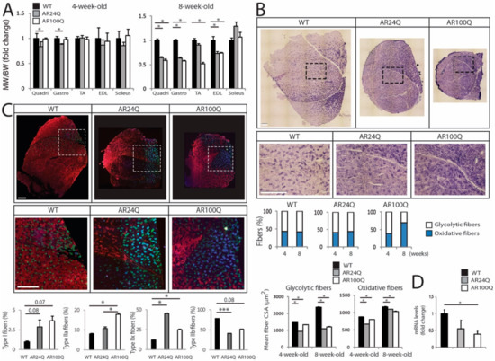 Switch from type IIb to type IIa and IIx fibers and altered muscle metabolism in AR100Q mice. (A) Muscle weight (MW) normalized to BW in 8-week-old WT (n = 14), AR24Q (n = 7) and AR100Q (n = 16) male mice. (B) NADH analysis of quadriceps and gastrocnemius of 4- and 8-week-old WT, AR24Q and AR100Q male mice (n = 3). Shown are representative images from 8-week-old mice. Inset position is shown by the dashed square box. Bars, 500 micron. Number of fibers (4-week-old): 1224 WT, 1224 AR24Q and 1237 AR100Q. Number of fibers (8-week-old): 1232 WT, 1257 AR24Q and 1219 AR100Q, all from 3 mice/genotype/age. (C) Immunofluorescence analysis of MyHC type I (blue), IIa (green), IIx (black) and IIb (red) from 8-week-old AR24Q and AR100Q male mice (n = 3). Shown are representative images. Inset position is shown by the dashed square box. Bars, 500 micron. (D) Real-time PCR analysis in the quadriceps of 8-week-old WT, AR24Q and AR100Q male mice (n = 3–4). Graphs, mean ± SEM. Statistical testing: One-way ANOVA followed by Newman-Keuls post-hoc test; * p < 0.05.