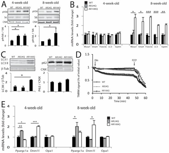 Activation of autophagy can be caused by or associated with mitochondrial dysfunction [36]. Mitochondrial abnormalities have been extensively described in SBMA cells, mice and patients [30,37]. By measuring mitochondrial membrane potential in myofibers isolated from the FDB muscle upon treatment with the F1F0-ATPase blocker, oligomycin, we found that the number of fibers with mitochondria depolarized by oligomycin was significantly (p < 0.05) increased in 8- and not 4-week-old AR100Q mice as well as control mice (Figure 5D and Supplemetary Figure S4). PGC1α (Ppargc1a) promotes mitochondrial biogenesis [38]. By real-time PCR analysis, Ppargc1a transcript levels were upregulated in the quadriceps of 4-week-old AR24Q mice and downregulated in AR100Q mice (Figure 5E). The mitochondrial fission marker, dynamin related protein 1 (Dnm1l, Drp1), was upregulated by 2-fold in AR100Q mice starting from 4 weeks of age, whereas the mitochondrial fusion marker, opticatrophy gene 1 (Opa1), did not change. Collectively, these observations indicate that AR100Q mice show severe and progressive muscle atrophy, altered muscle homeostasis and metabolism and mitochondrial dysfunction.