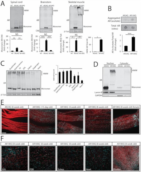 Next, we analyzed AR expression in vulnerable tissues. By Western blotting analysis of spinal cord, brainstem and skeletal muscle total lysates monomeric AR was increased by 5-, 15- and 48-fold, respectively, in 8-week-old AR24Q mice, whereas monomeric polyQ-expanded hAR was increased by 1-, 1.4- and 1.5-fold in AR100Q mice, respectively (Figure 6A). PolyQ-expanded proteins and misfolded proteins linked to MN diseases, such as mutant superoxide dismutase 1, form micro-aggregates, which can be detected as high-molecular-weight (HMW) species that accumulate in the stacking portion of polyacrylamide gels and by filter retardation assay [23,39,40]. These micro-aggregates can be detected in the presence of both low (0.1%) and high (2%) concentrations of SDS and in the latter case such species are defined as 2% SDS-resistant aggregates [41]. No 2% SDS-resistant aggregates were detected in both spinal cord and brainstem, in which we rather detected polyQ-expanded AR aggregates in the milder buffer containing 0.1% SDS (Figure 6A, Supplemetary Figure S5), as previously reported in other transgenic SBMA mouse models with constitutive expression of AR [7,23]. Rather, 2% SDS-resistant aggregates of polyQ-expanded AR were detected in skeletal muscle (Figure 6A,B). AR aggregation has been extensively characterized in neurons, but not in muscle [7,15,42,43,44]. Therefore, we further explored this aspect of muscle pathology. PolyQ-expanded AR aggregation was detected as early as 4 weeks of age in muscles composed of both fast-glycolytic and slow-oxidative fibers and that degenerate in SBMA, such as quadriceps, gastrocnemius and TA, in muscles mainly composed of fast-glycolytic fibers, such as EDL and to a lower extent in muscles mainly composed of slow-oxidative fibers, such as soleus and diaphragm and heart that are mildly affected in SBMA, indicating that polyQ-expanded AR aggregation occurs early and is affected by muscle metabolism (Figure 6C). Importantly, no polyQ-expanded AR aggregation was detected in other peripheral tissues, including testis and adrenal glands, which express levels of AR similar to muscle (Supplemetary Figure S6A). Moreover, the amount of aggregated polyQ-expanded AR compared to monomeric AR was higher (1.4-fold) in male compared to female AR100Q mice (Supplemetary Figure S6B). Notably, by performing subcellular fractionation on frozen muscles, we observed that polyQ-expanded AR aggregates were enriched in the nuclear fraction (Figure 6D). These results show that deposition of 2% SDS-resistant AR aggregates is polyQ length-dependent, is at least in part androgen-dependent and mainly occurs in skeletal muscle myofibers as an early event.
