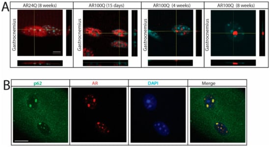 A key feature of muscle pathology of AR100Q mice was the presence of 2% SDS-resistant AR aggregates and intranuclear inclusion bodies. Inclusion body formation was an early event that correlated with disease progression and outcome in SBMA mice. During muscle development, polyQ-expanded AR had a diffuse distribution in the nuclei, which then transitioned to a punctate pattern as serum testosterone levels increased. Protein misfolding, aggregation and inclusion body formation are associated not only with toxic GOF, but also with LOF mechanisms. Several proteins of the protein quality control system, such as proteasome subunits, chaperones and ubiquitin, together with cytoskeletal proteins, transcription factors and RNA binding proteins, were detected in inclusions. Sequestration of these proteins may disrupt cellular proteostasis, leading to aggregation of metastable proteins, ultimately resulting in a disease state [60]. The proteostasis network is regulated by cell-autonomous and non-cell-autonomous signaling through communication between subcellular compartments and across different cells and tissues [61,62]. Disruption of proteostasis in muscle may then result in MN dysfunction and degeneration in SBMA as well as in other MN diseases. Inclusions may have a different impact on neurotoxicity depending on the subcellular compartment in which they form. For instance, the formation of a specific type of inclusion bodies known as aggresomes in the cytosol may be protective, as they represent sites of protein degradation [63,64]. Moreover, mutations that lead to cytosolic retention of polyQ-expanded AR may favor degradation of the disease protein via autophagy [56]. Whether aggregates and inclusions either positively contribute to the irreversible neurodegenerative process that leads to MN loss or are the result of a physiological defensive process that cells activate to confine toxic species to specific subcellular compartments remains a matter of debate. Neuronal intranuclear inclusion formation did not correlate with neuronal death in SBMA [65,66,67], HD [59] and SCA1 [58], indicating that this is a phenomenon distinct from neuronal death. Rather, neurons with inclusion bodies from Alzheimer’s disease and Parkinson’s disease patients seem to be healthier than neurons with no detectable inclusions [68,69]. Inclusion formation did not correlate with neurodegeneration in HD and polyQ-expanded huntingtin-positive inclusions were more abundant in the cortex than striatum [70]. Consistent with these observations, inclusion body formation correlated with a higher probability of survival of neurons expressing polyQ-expanded huntingtin in vitro [71] and in vivo [72], supporting the concept that inclusion bodies may represent a defense strategy of the cells against protein misfolding and aggregation. Intriguingly, the size of inclusion bodies increased with age in HD brain [73], as well as in SBMA myonuclei. Although we cannot establish whether these inclusions form as an adaptive or maladaptive response of the cells to the presence of polyQ-expanded AR, several observations lead us to speculate that these species are important for disease pathogenesis. These species were detected exclusively in the nuclei of myofibers, their formation correlated with the physiological increase of androgens in mouse and the extent of accumulation of polyQ-expanded AR into inclusions correlated with disease severity.