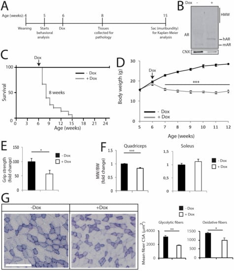 The transgenic mice described above express hAR in a constitutive fashion, i.e., from development. Therefore, we asked whether the expression of mutant AR in the adult mouse recapitulates the major symptoms of SBMA observed in mice with constitutive expression of polyQ-expanded AR. To acutely induce polyQ-expanded AR expression in vivo, we generated transgenic mice for doxycycline (dox)-inducible expression of AR100Q (hereafter referred to as iAR100Q for inducibleAR100Q), which were subsequently crossed with mice expressing rtTA under the CMV promoter (hereafter referred to as rtTA mice) [45]. iAR100Q /rtTA double transgenic mice were fertile, viable and did not show any overt phenotype in the absence of dox. Administration of dox (0.1, 0.2 and 1g/L) to pregnant dams did not give birth to any double-positive pups, indicating that induction of hAR transgene is highly toxic for embryo development, possibly due to high copy number insertion (Supplemetary Figure S9 and data not shown). To induce polyQ-expanded AR expression in adulthood, while avoiding compensatory or toxic effects occurring during development and before sexual maturation, we started dox treatment at 6 weeks of age (Figure 8A), which is approximately the time of disease onset in transgenic SBMA mice constitutively expressing mutant AR (Figure 1). While treatment of iAR100Q/rtTA mice with 0.1 and 0.2 g/L of dox was not sufficient to induce hAR expression and trigger disease manifestations, administration of 1 g/L of dox efficiently induced hAR expression, but not aggregation (Figure 8B). Dox treatment caused premature death (Log-rank test p = 0.001) with a median survival of 8 weeks of age (maximum life duration was 15 weeks of age) (Figure 8C). Similar to the transgenic mice constitutively expressing mutant AR, iAR100Q/rtTA mice manifested a progressive loss of BW and reduced muscle strength (Figure 8D,E), a phenotype not observed in WT, rtTA and iAR100Q mice (Supplemetary Figure S10A–D).