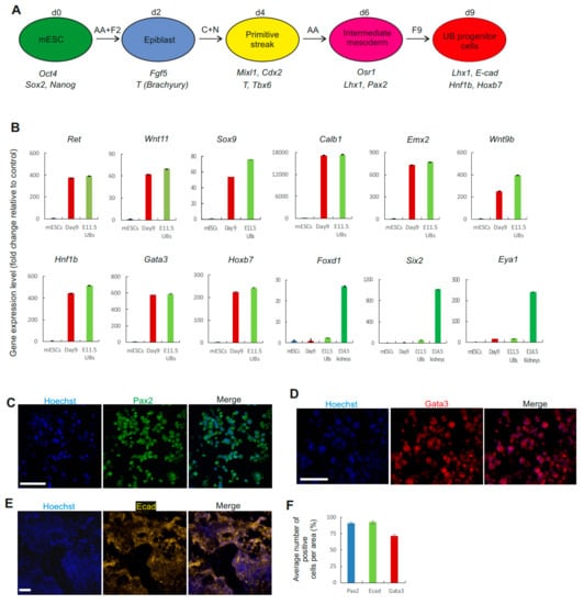 Figure 1. Differentiation of mouse embryonic stem cells (mESCs) to ureteric bud (UB) progenitor cells. (A) Schematic of the differentiation protocol of mESCs into UB progenitor cells. AA: Activin A; F2: FGF2; C: CHIR99021; N: Noggin; F9: FGF9. (B) Graphs of qPCR results showing the gene expression (fold change) of ureteric bud markers relative to mESC. No expression of stroma (Foxd1) and nephron progenitor cell markers (Six2 and Eya1) was observed at day 9 of differentiation. (n = 3). (CE) Immunocytochemistry of Pax2, Ecad, and Gata3 in mESCs on day 9 of differentiation. Scale bars, 50 μm. (F) Quantification of the number of cells expressing Pax2, Ecad, and Gata3 at day 9 of differentiation. n = 3 samples per marker (3 randomly chosen areas in 3 independent experiments).