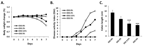 Assessment of (A) body weight change, (B) disease activity index (DAI), and (C) colon length in dextran sodium sulfate (DSS)-treated mice. Mice were given 2%, 3.5%, and 5% DSS in drinking water for 7 days. Each value is presented as the mean ± SD for six mice. *** Significantly different from the control (DSS 0%) (Student’s t-test, p < 0.001).