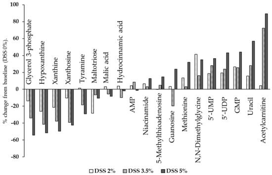 Endogenous metabolites are known to be easily changed by environmental stress, chemical exposure, and genetic variations, even in the absence of a diseased state; thus, metabolite analysis provides comprehensive information on energy metabolism, precursors of proteins and carbohydrates, gene expression regulation, and signaling molecules [41,42,43,44,45,46]. In this study, we analyzed small molecular metabolites, including the intermediate and final products of cellular regulatory processes, and they could be clearly distinguished by multivariate statistical analysis (Figure 8 and Figure 9), depending on the supplemented DSS dosage.