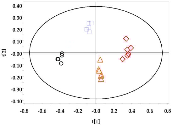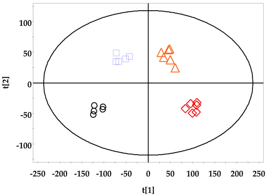 OPLS-DA score plot based on the 1H-NMR spectra of the DSS-treated group and control group. ○: DSS 0%; □: DSS 2%; △: DSS 3.5%; ◇: DSS 5% (R2X = 0.738, R2Y = 0.919, and Q2 = 0.258).