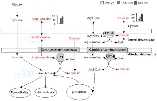 The metabolites determined by 1H-NMR and UPLC-QTOF-MS/MS in the present study responded differently to different concentrations of DSS and significant differences (p < 0.05) in their levels were observed between the DSS-treated group and control group. The levels of acetyl-carnitine and carnitine were elevated in the DSS-treated group. Acetyl-carnitine and carnitine are important for the β-oxidation of fatty acids, which mainly occurs in the mitochondria (Figure 10), to regulate lipid metabolism and transport fatty acids into the mitochondria [47,48]. They also have antioxidant and anti-inflammatory properties [49]. Carnitine also has an antioxidant and anti-inflammatory capacity [48,50]. Some studies have reported that acetyl-carnitine and carnitine are associated with liver function, liver diseases, neurologic disorders, and IBD [22,51,52,53,54]. Therefore, liver damage due to intestinal inflammation occurs as a result of changes in the concentrations of acetyl-carnitine and carnitine. These changes suggest that intestinal inflammation affects oxidative stress, inflammatory cells, osmosis, and β-oxidation of fatty acids in the liver.