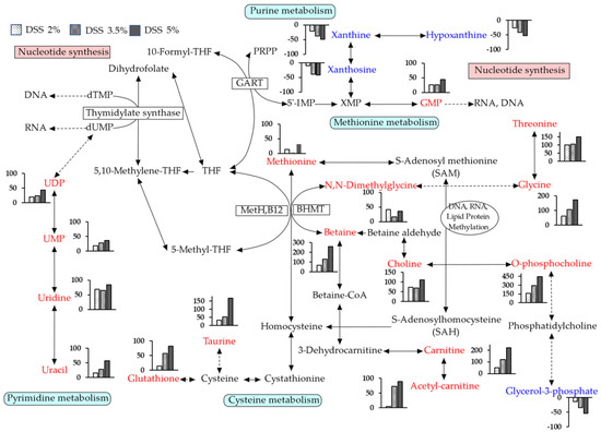 Mass spectrometry analysis identified changes in some metabolites that were not identified in the NMR, such as nucleic acids (5’-methylthioadenosine, adenosine monophosphate, guanosine, guanosine monophosphate, uridine 5’-diphosphate, uridine 5’-monophosphate, and xanthosin), purines (hypoxanthine and xanthine), pyrimidines (uracil), N,N-dimethylglycine, glycerol 3-phosphate, hydrocinnamic acid, acetylcarnitine, malic acid, maltoriose, methionine, niacinamide, and tyramine. The average concentrations of these metabolites, as determined using the Student’s t-test, are shown in Table 3, and Figure 7 shows the relative concentrations of these metabolites in the DSS-treated group liver compared to the control group liver. From among the abovementioned 19 metabolites, the levels of six metabolites increased (methionine, N,N-dimethylglycine, uridine 5’-monophosphate, uridine 5’-diphosphate, guanosine monophosphate, uracil, and acetylcarnitine), while those of five metabolites decreased (glycerol 3-phosphate, hypoxanthine, xanthine, xanthosine, and maltotriose) in the DSS-treated group compared to the control group. Overall, the levels of purine metabolites (hypoxanthine, xanthine, and xanthosine) decreased and those of pyrimidine metabolites (uridine 5’-monophosphate, uridine 5’-diphosphate, uridine, and uracil) increased in the DSS-treated group compared to the control group.