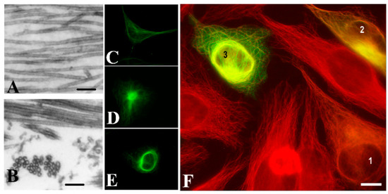Tubulin Polymerization Promoting Protein (TPPP/p25)-derived ultrastructural organization of microtubules. Images of microtubules without or with human recombinant TPPP/p25: (A) control, (B) TPPP/p25-induced microtubule bundling, as visualized by electron microscopy. HeLa cells expressing pEGFP-TPPP/p25 (green): (C) control, (D) aggresome; (E) perinuclear cage; HeLa cells transiently transfected with EGFP-TPPP/p25 (green): (F) different expression levels produce distinct microtubule (red) ultrastructures: (1) alignment to the microtubule network, (2) aggresome formation, (3) perinuclear cage as visualized by immunofluorescence microscopy (selected from [9] and [8]). Scale bar: 100 nm (A,B); 10 μm (C–F).