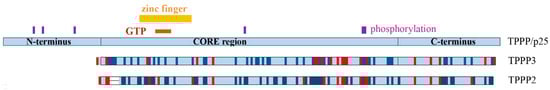 Scheme of the human TPPP/p25, TPPP3, and TPPP2. Similar and different residues are indicated by dark blue and red, respectively. The zinc finger motif, a consensus GTP-binding segment and phosphorylation sites on TPPP/p25 are also indicated.