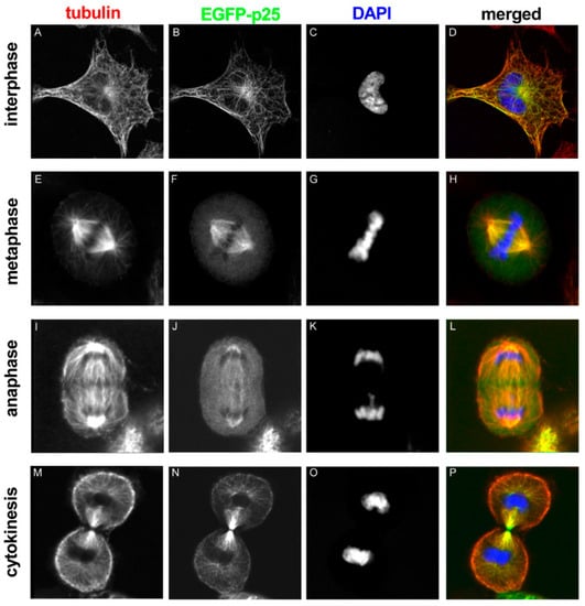 EGFP-TPPP/p25 localization in transfected NRK cells at different stages of mitosis. Tubulin, TPPP/p25 and DNA are red, green and blue in the merged images, respectively [8].