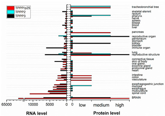Both TPPP/p25 and TPPP3, but not TPPP2, have been isolated from bovine brain, and they associate to microtubules, displaying MAP-like features [6,15] (Figure 4). TPPP/p25 has been identified at protein level predominantly in oligodendrocytes (OLGs), neuropil and fiber-like structures of the CA3 hippocampal region [5,16]. TPPP2 has not be detected in adult mammalian brain [17]. The similarity of TPPP/p25 to TPPP3 is manifested in their intrinsically disordered characteristics; in addition, they are involved in developmental processes of the brain [16,18] and the musculoskeletal system [19], respectively. TPPP2 is involved in spermatogenesis [20] and its knockdown leads to infertility in mice [21]. The main characteristics of the three TPPP proteins can be found in databases, such as the HUGO Gene Nomenclature Database: TPPP/p25 [22], TPPP3 [23], and TPPP2 [24].