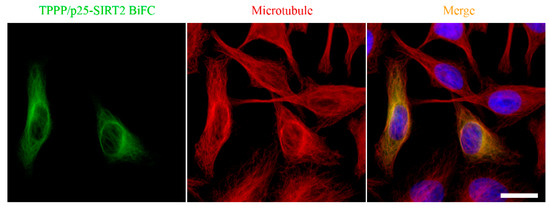SIRT2, as a tubulin deacetylase [50], plays an essential role in mitosis, as suggested by its increased abundance during cell division [58,59]. SIRT2 is abundant in neurons, its level is relatively high in OLGs, the major constituent of the myelin sheath [60,61,62,63]. The inhibition of SIRT2 by TPPP/p25 manifests itself within the SIRT2-tubulin-TPPP/p25 ternary complex, the concentration-dependent formation of which was quantified by experimental-based mathematical modelling [64]. Co-localization of the SIRT2-TPPP/p25 complex with the microtubule network was visualized in HeLa cells by immunofluorescence microscopy using Bimolecular Fluorescence Complementation technology [64] (Figure 5). However, the TPPP/p25-associated microtubule ultrastructures appeared to be resistant against SIRT2 activity due to the inaccessibility of the acetylated Lys40 residue. It has been proposed that the structural and functional effects of TPPP/p25 on the tubulin deacetylase SIRT2 could provide the fine-tuning of the regulation of microtubule dynamics and stability [64].