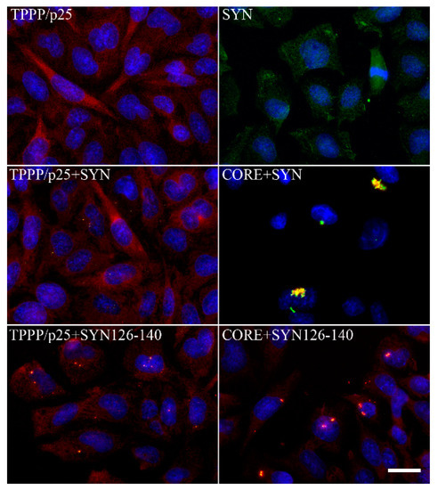 Intracellular aggregates of TPPP/p25 and α-synuclein (SYN) and their truncated forms in CHO10 cells. Uptake of the SYN and/or TPPP/p25 forms from the medium following their premixing as detected by immunofluorescence microscopy: Full length or double truncated (CORE) TPPP/p25 and/or SYN, FITC SYN126–140 (adapted from [111]). Scale bar: 5 μm.