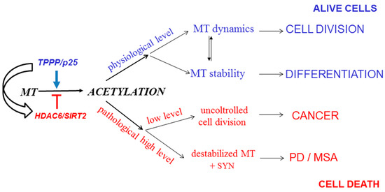 From regulation of microtubule acetylation to potential connection of Parkinson’s disease (PD) and cancer. MT: microtubule. MSA: multiple system atrophy.
