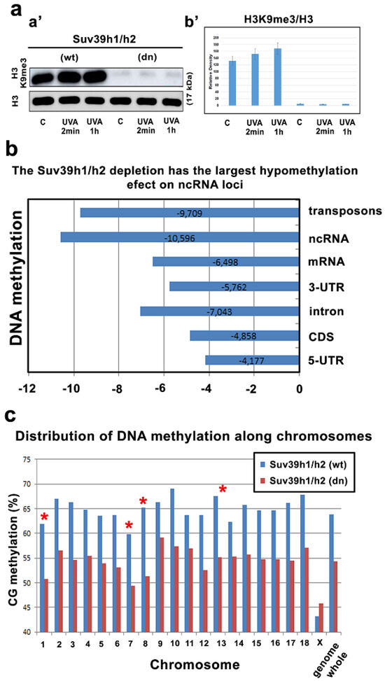 Suv39h1/h2 depleted cells are characterized by global DNA hypomethylation. (a,a’) H3K9me3 is decreased in Suv39h1/h2 dn cells compared to the level in Suv39h1/h2 wt cells. (b’) Data from Western blot analysis were quantified by ImageJ software and normalized to the total protein levels and histone H3. (b) DNA methylation in distinct genomic regions was analyzed by whole-genome sequencing. The level of DNA methylation was studied in the Suv39h1/h2 wt and Suv39h1/h2 dn cells. (c) Global level of DNA methylation in individual autosomes and chromosome X in the Suv39h1/h2 wt and Suv39h1/h2 dn cells. Red stars show those chromosomes prone to DNA demethylation in Suv39h1/h2-depleted cells. Asterisks (*) show chromosomes characterized by the highest level of demethylation in Suv39h1/h2 depleted cells.