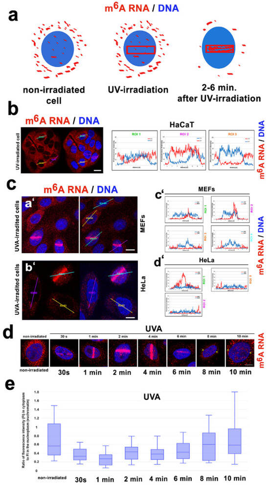In microirradiated cells, m6A RNA diffused from the cytoplasm to the cell nucleus. (a) A pictorial illustration of m6A RNA distribution in the cytoplasm and the cell nucleus. The red frame in panel (a) shows the selected genomic region exposed to local laser microirradiation. (b) The distribution of m6A RNAs in the human keratinocytes (HaCaT cell line) with physiological genomes. (c) m6A RNAs in (a’), (c’) wild-type MEFs and (b’), as well as (d’) cervical carcinoma HeLa cells. Cells were exposed to laser microirradiation. Quantification of the fluorescence intensity of the Alexa 594-stained m6A RNAs was performed using LAS X software. Scale bars represent 15 µm. Diffusion of m6A RNA from the cytoplasm to the cell nucleus exposed to (d), local laser microirradiation. Scale bars show 5 µm. DAPI (blue) was used as a counterstain. HeLa cells were used for these experiments. Panel (e) shows the quantification of the fluorescence intensity in microirradiated ROIs. This analysis was performed by LAS X software connected to a Leica laser-scanning confocal microscope.