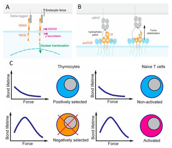 T cell progenitors from the bone marrow enter the thymus, which provides discrete microenvironments for both their commitment and stepwise maturation to the T lineage [7]. One such microenvironmental cue derives from various Notch ligands expressed on the surface of cells adjacent to these multipotent hematopoietic progenitors that express the Notch receptor (Figure 2A). The reliance on forces to activate Notch exemplifies the importance of mechanotransduction as Notch signaling facilitates the development, differentiation, proliferation and survival of these cells [19,20,21,22]. There are four Notch receptors (Notch1–4) and five Notch ligands (Jagged1, 2 and DLL1, 3 and 4). Each Notch receptor can bind to any of the five ligands with different affinities. Upon binding, the complex is under mechanical tension due to intercellular movements and endocytosis of the ligand-expressing cells [23]. Force-induced conformational changes in the Notch receptor reveal cryptic sites for proteolytic cleavage, which releases the Notch intracellular domain (NICD) that functions as a transcriptional cofactor [23,24,25,26]. This requirement for mechanical force to activate Notch is well known. However, Notch bonds with the different ligands likely transmit the duration and magnitude of force differently due to their distinct dynamic bond types [26]. Two approaches have been used to evaluate the force requirement to influence the degree of NICD translocation and eventually transcription: (i) the tension gauge tether (TGT) [25] and (ii) the biomembrane force probe (BFP) [27]. TGTs are DNA duplexes that are anchored to a surface on one strand and harbor the ligand on the other strand. TGTs are used to limit the endogenous force that the cell can generate and apply to the receptors–ligand bonds, since the DNA duplex would rupture when the force exceeds a threshold. The force threshold can be controlled by changing the G–C sequence content and whether the force is applied to unzip (the anchor and the ligand are on the same ends of duplex) or shear (the anchor and the ligand are on opposite ends of duplex) the DNA duplex to rupture it. In BFP, a precisely controlled force waveform is applied on the receptor via the engaged ligand via an ultrasensitive force transducer to allow for a range of mechanical measurements, including the force required to rupture the bond, the lifetime the bond endured, the elasticity of the receptor–ligand complex, and the conformational change of the molecule [28].