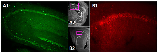 TRPC4 and TRPC5 expression in mouse dorsal hippocampus. (A1) TRPC4 expression in a sagittal slice of the hippocampus. (A2) Low magnification image indicating the location of the image in A1. (B1) TRPC5 expression in CA1 in a sagittal slice of the hippocampus. (B2) Low magnification image indicating the location of the image in B1.