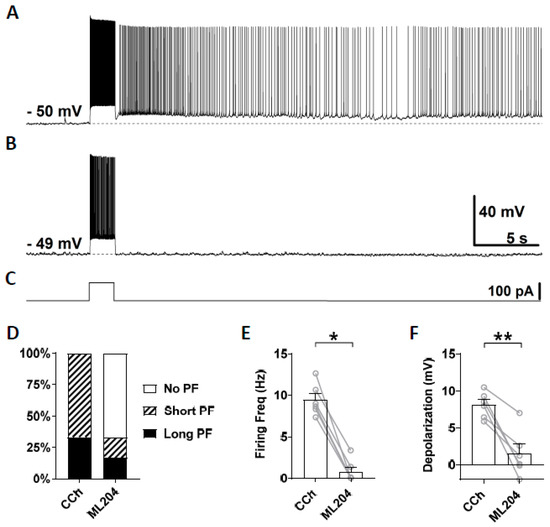 First, we tested ML204, a blocker of the TRPC4 channel which has a higher selectivity for TRPC4 over TRPC3, TRPC5, and TRPC6 [67,74,75]. At the concentration of 10 μM, ML204 mainly blocks TRPC4 channels. After stable recording was obtained in the normal ACSF, persistent firing was tested in the presence of carbachol (10 μM; Figure 3A). If persistent firing was observed, ML204 (10 μM) was subsequently bath applied in addition to carbachol, and persistent firing was tested 15 min later (Figure 3B). Out of six cells that showed persistent firing, persistent firing was completely blocked in four cells and strongly reduced in the remaining two cells (Figure 3B,D). Both the firing frequency and depolarization, measured during the 3 s period after the stimulation, were significantly reduced by the application of ML204 (Frequency: Figure 3E, Wilcoxon test, p ≤ 0.05, n = 6; Depolarization: Figure 3F, paired t-test, p ≤ 0.01, n = 6). This effect of the ML204 was reversible in two cells in which we tested a washout of the ML204 (data not shown). These results suggest an involvement of TRPC4 channels in the mechanism underlying persistent firing evoked by cholinergic agonists.