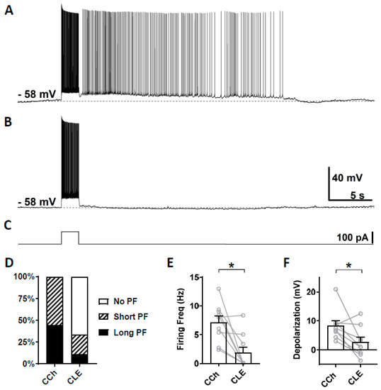 Second, we tested clemizole hydrochloride (CLE), a TRPC5 blocker, which has a higher selectivity for TRPC5 over TRPC4 [68]. The half-maximal inhibitory concentration (IC50) for TRPC5 and TRPC4 are 1.1 and 6.4 µM, respectively [68]. When used at 3 µM concentration, clemizole hydrochloride will mainly block TRPC5 channels. As in the section above, persistent firing was first tested in the presence of carbachol (Figure 4A) and then in the presence of clemizole hydrochloride (Figure 4B). In six out of nine cells, persistent firing was completely blocked after 15 min in 3 µM clemizole hydrochloride, while in one out of the nine cells, persistent firing was strongly reduced and, in two remaining cells, persistent firing was not affected (Figure 4D). The firing frequency was strongly and significantly reduced by the application of 3 μM clemizole hydrochloride (Figure 4E, Wilcoxon test, * p ≤ 0.05, n = 9). The depolarization was strongly reduced by the application of clemizole hydrochloride in all but one cell, which was unaffected (Figure 4F, Wilcoxon test, * p ≤ 0.05, n = 9). These results suggest an involvement of TRPC5 channels in the mechanism underlying persistent firing.