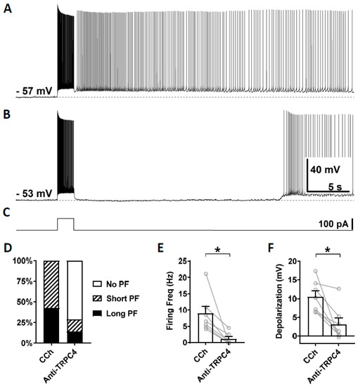 To test the involvement of TRPC4 channels, anti-TRPC4 antibody was diluted (1:100) in the intracellular solution and, after the rupture of the membrane, was able to diffuse inside the cytosol. This dilution, 1:100, was chosen based on a previous work on CA1 pyramidal cells [72]. In this and following experiments with antibodies, carbachol (10 µM) was applied right after the membrane was ruptured and a stable recording was established. Three minutes after the application of carbachol, which was 5 min after the rupturing of the membrane, persistent firing was tested for the first time using the same current injection used in the previous section. This served as the control recording (Figure 6A). Then, 15 min after the rupturing of the membrane, persistent firing was tested again (Figure 6B). Out of the seven cells which showed persistent firing in the control condition, persistent firing was completely blocked in five cells, and the remaining two cells exhibited a weaker persistent firing 15 min after the rupturing of the membrane (Figure 6D). The firing frequency of persistent firing was significantly suppressed compared to the control recordings (Figure 6E; Wilcoxon test, p ≤ 0.05, n = 7). The post stimulus depolarization was reduced in all seven neurons by the anti-TRPC4 antibody application (Figure 6F, Wilcoxon test, p ≤ 0.05, n = 7).