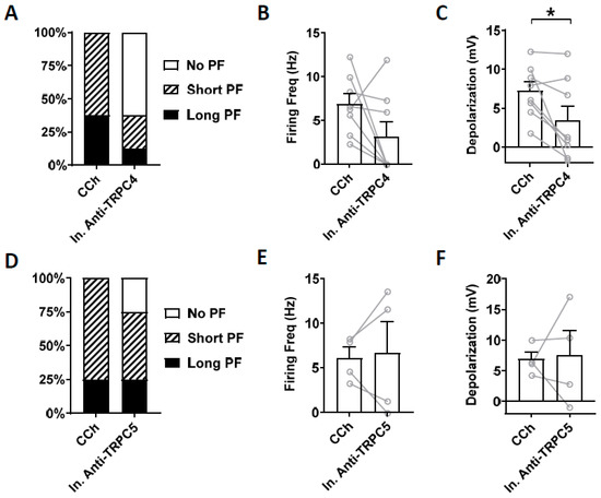 The effect of intracellular application of inactivated antibodies. (A–C) Inactivated TRPC4 antibody (In. Anti-TRPC4, 1:100). (A) Percentages of cells that showed persistent firing in control (5 min) and 15 min after the rupturing of the membrane. (B) Post-stimulus firing frequency (Wilcoxon test, ns, p = 0.11, n = 8). (C) Post-stimulus depolarization (paired t-test, * p ≤ 0.05, n = 8). (D–F) Inactivated TRPC5 antibody (In. Anti-TRPC5, 1:100). (D) Percentages of cells that showed persistent firing in control (5 min) and 15 min after the rupturing of the membrane. (E) Post-stimulus firing frequency (paired t-test, p = 0.82, n = 4). (F) Post-stimulus depolarization (paired t-test, p = 0.64, n = 4).