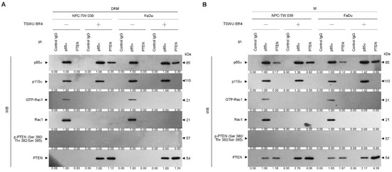 As the plasma membrane localization and negative regulator activity controlling the Akt activation of PTNE are modulated by p85α through the formation of p110α-free p85α-unphosphorylated PTEN complexes in the plasma membrane [9], we next examined whether TSWU-BR4 treatment affected the physical interaction between p85α, p110α, Rac1, or PTEN in the lipid raft membranes. In vehicle-treated cells, p110α and GTP-Rac1 were coimmunoprecipitated from the DRM fractions using an antibody specific for p85α; however, immunoprecipitated p85α formed complexes with p110α, GTP-Rac1, and PTEN in the M fractions. Immunoprecipitation of PTEN, followed by immunoblotting for p85α, p110α, p-PTEN (Ser 380/Thr 382/Ser 385), PTEN, and GTP-Rac1 revealed a small amounts of p85α−unphosphorylated PTEN complexes in the M fractions but not in the DRM fractions, indicating that p85α formed a complex with p110α and GTP-Rac1 but did not interact with unphosphorylated PTEN in the lipid raft membranes of vehicle-treated cells. When the cells were subjected to TSWU-BR4 exposure, anti-p85α immunoprecipitations from the DRM and M fractions contained p85α:p110α:unphosphorylated PTEN. Reprecipitation with anti-PTEN antibodies, followed by anti-p85α, -p110α, -Rac1, PTEN, and -p-PTEN (Ser 380/Thr 382/Ser 385) immunoblot analysis was carried out to confirm that a complex with p85α and unphosphorylated PTEN was detected in the DRM and M fractions of TSWU-BR4-treated cells (Figure 3A,B). These observations indicate that TSWU-BR4 induces an association between p85α and unphosphorylated PTEN in the lipid raft membranes of cancer cells.