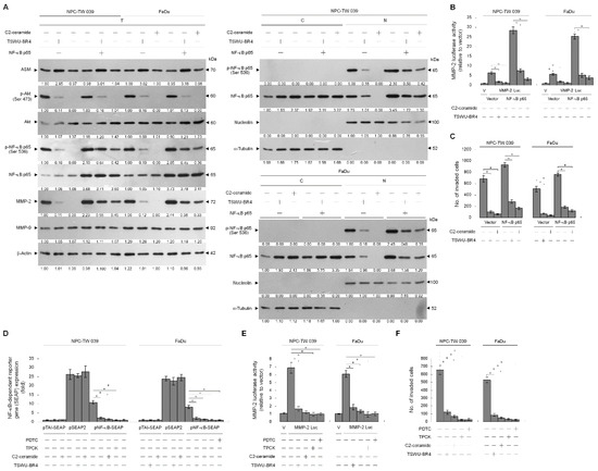 PI3K–Akt signaling is reported to be involved in cancer cell invasion by modulating NF-κB-mediated MMP-2 expression through the control of Rac1 activity [35,40,41]. Hence, we next investigated the possible association of ASM-mediated PI3K–Akt signaling and NF-κB-dependent expression of MMP-2. NF-κB p65, MMP-2 promoter-driven luciferase reporter, and NF-κB-responsive secreted alkaline phosphatase (SEAP) reporter were ectopically expressed in TSWU-BR4-treated NPC cells and subsequently evaluated NF-κB-dependent SEAP activity, MMP-2 promoter activity, and cellular localization and phosphorylation of NF-κB. TSWU-BR4 treatment inhibited Akt (Ser 437) phosphorylation, NF-κB p65 (Ser 536) phosphorylation, p-NF-κB p65 nuclear translocation, NF-κB-dependent SEAP activity, MMP-2 promoter activity, and cell invasion in a manner similar to that occurring with C2-ceramide. An increased level and nuclear localization of p-NF-κB (Ser 536), MMP-2 expression, and cell invasive activity were observed in cells that overexpressed NF-κB. Ectopic expression of NF-κB resulted in resistance to TSWU-BR4- or C2-ceramide-induced abrogation of MMP-2 expression and cell invasion (Figure 6A,B). Treatment with TPCK or PDTC was shown to selectively inhibit NF-κB activity, resulting in significantly attenuated NF-κB-dependent SEAP activity, MMP-2 promoter activity, and cell invasive activity. This result is consistent with the finding in TSWU-BR4- or C2-ceramide-treated cells (Figure 6D,E,F). Thus, induction of ASM-mediated ceramide generation by TSWU-BR4 disrupted the lipid raft membrane-associated GRP78−p85α−GTP-Rac1-mediated signaling and then impaired NF-κB-mediated MMP-2, triggering the inhibition of NPC cell invasion.