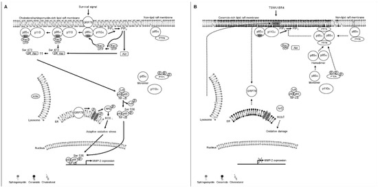 Although the glucose regulated protein 78 (GRP78) is regarded as a major endoplasmic reticulum (ER) chaperon essential for the quality control of protein folding to modulate the ER stress signaling [12], it can form complexes with PI3K on cell surface to increase PI3K−Akt activity and to enhance PIP3 generation in cancer cells [13]. The in vitro and in vivo results show that GRP78 is preferentially localized on the cell surface of cancer cells but not in normal cells [14,15,16]. ER is also recognized as a major site of the biosynthesis of cholesterol and lipids [17], as evidenced by involvement of GRP78 in regulating lipid metabolism of cancer cells and its localization in ER [18]. Additionally, GRP78 modulates antioxidant activities of glutathione and NAD(P)H:quinone oxidoreductase by inducing activation of protein kinase RNA-like endoplasmic reticulum kinase and nuclear factor erythroid 2 p45-related factor 2 [19], contributing the protection of cancer cells from oxidative stress-induced damage [20,21]. Increased formation of cell surface GRP78−PI3K complexes in cancer cells confers a beneficial effects on cell survival and resistance to reactive oxygen species (ROS)-induced lipotoxicity [13,22].