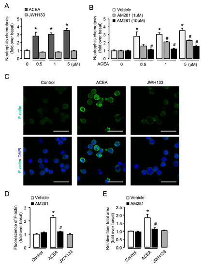 Cytoskeletal remodeling is a prerequisite for cell chemotaxis and migration [29]. To evaluate the involvement of CB1 in cytoskeletal remodeling, neutrophils were stimulated with ACEA or JWH133 and then stained with FITC-conjugated phalloidin. Our findings indicated that ACEA-treated neutrophils were able to form a well-defined F-actin-rich leading edge (Figure 3C) and induced an increase in F-actin content (Figure 3D), whereas JWH133-treated neutrophils did not show obvious polymerized F-actin (Figure 3C,D). Consistent with the chemotaxis results above, AM281 could significantly reduce the increase of F-actin content induced by ACEA (Figure 3D). Moreover, the amount and distribution of actin fibers in neutrophils were determined by high content analysis. Treatment with ACEA showed significant increases in the total fiber area, which can be reversed by AM281 (Figure 3E). These results support that CB1 rather than CB2 plays an important role in neutrophil chemotaxis and cytoskeletal remodeling.