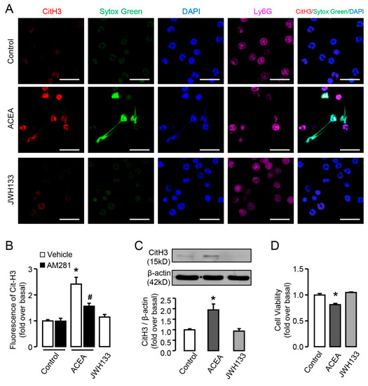Isolated BM neutrophils were plated to adhere in fibronectin-coated 96-well plates (Corning) or Nunc glass base dishes (Thermo Fisher Scientific, MA, USA) and pretreated with vehicle, AM281 (10 μM), NAC (5 mM), PTX (5 ng/mL), YM254890 (10 μM) or SB203580 (10 μM) for 20 min, respectively, and stimulated for 2 h with ACEA or JWH133. Neutrophils were fixed by 4% paraformaldehyde for 30 min, after blocked with 2% BSA (Roche, Switzerland), they were incubated with the specific primary antibodies for CitH3 (1:200), MPO (1:200) or Ly-6G (Clone 1A8, 551459, 1:100, BD pharmingen), CB1 (10006590, 1:200, Cayman Chemical, Ann Arbor, MI, USA), CB2 (1:200, 101550, Cayman Chemical) or Rabbit IgG Isotype Control (1:100, 10500C, Invitrogen, CA, USA). Cy3-conjugate affinipure goat-anti-rabbit IgG (111165003, 1:100) or Cy5-conjugate affinipure goat-anti-rat IgG (112175143, 1:100, Jackson Immunoresearch, PA, USA) were as secondary antibodies. For F-actin, neutrophils were fixed by 4% paraformaldehyde for 30 min, penetrated by 0.5% Triton X-100 for 15 min and after blocked with 2% BSA, FITC-conjugated phalloidin (A12379, 1:100, Molecular Probes, OR, USA) was incubated for 20 min. Nuclei were stained with DAPI and SYTOX Green. The sample was observed under confocal microscope (LSM510, Carl Zeiss MicroImaging GmbH, Germany). For high content analysis, the plates were imaged on Thermo Scientific CellInsight personal cell imaging platform (Thermo Fisher Scientific). Fluorescence intensity of each well was analyzed by Cellomics Cell Health Profiling BioApplication software.