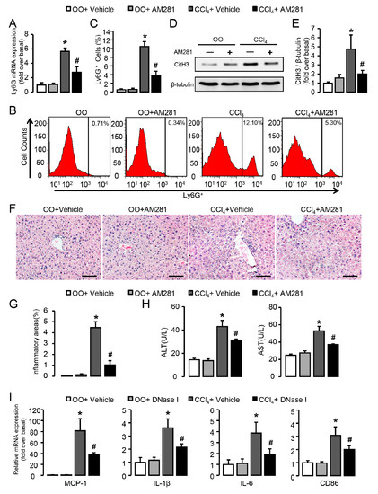Blockade of CB1 significantly attenuates neutrophil infiltration and liver inflammation in CCl4-treated mice. (A) Ly6G mRNA expression in CCl4- or olive oil (OO)-treated liver with or without the administration of AM281. (B,C) Representative FACS plots and quantification for neutrophils in liver. (D,E) CitH3 protein levels in liver. (F) Representative H&E staining images of liver sections. Scale bars, 100 μm. (G) Quantitative analysis of liver inflammation areas. (H) Alanine aminotransferase (ALT) and aspartate aminotransferase (AST) levels were detected by chemistry analyzer. (I) mRNA expression of MCP-1, IL-1β, IL-6, and CD86 in CCl4- or OO-treated liver with or without the administration of DNase I. Data are presented as the mean ± SEM. N = 6 per group. * p < 0.05 vs. OO. # p < 0.05 vs. CCl4-treated alone.