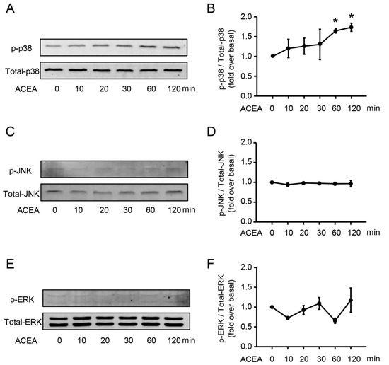 ACEA increases the protein level of phosphor-p38 in neutrophils. (A,B) Phosphor-p38 and total p38 expression after ACEA treatment was measured by Western blot. (C,D) Phosphor-JNK and total JNK expression. (E,F) Phosphor-ERK and total ERK expression.Data are presented as the mean ± SEM. N = 3 per group. * p < 0.05 vs. control.