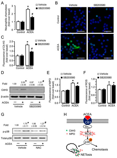 Moreover, ACEA-induced neutrophil chemotaxis was significantly suppressed by p38 inhibitor SB203580 (Figure 10A), indicating the key role of p38 in neutrophil chemotaxis. In case of CB1-mediated NETosis, p38 inhibition restrained CitH3 expression detected by both fluorescence (Figure 10B,C) and Western blot (Figure 10D). Similarly, lower MPO fluorescence was observed in neutrophils pre-incubated with p38 inhibitor before ACEA stimulation (Figure 10E). These results indicate that CB1-mediated p38 phosphorylation is involved in neutrophil chemotaxis and NETosis. Furthermore, inhibition of p38 had no effect on the production of ROS (Figure 10F), whereas elimination of ROS inhibited CB1-mediated phosphorylation of p38 (Figure 10G), suggesting that ROS was upstream of p38. Combining the above results, p38 MAPK signaling pathway is required for CB1-mediated neutrophil chemotaxis and NETosis, and locates in the downstream of ROS (Figure 10H).