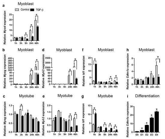 TGF-β reduces myogenic gene expression. (a,b,d,f) In myoblasts, expression levels of Myod (a) were reduced by TGF-β after 9 h compared to those of untreated cells, while expression levels of Myog (b) and Myh3 (d) were reduced after 24 h. Id1 expression levels (f) were induced after 1 h and repressed after 24 and 48 h. (c,e,g) In myotubes, the expression levels of Myog (c) were unaffected by TGF-β, while expression levels of Myh3 (e) were reduced compared to those of untreated cells after 24 and 48 h. Expression levels of Id1 (g) were induced after 1 h and remained slightly elevated at later time points. (h) In untreated myoblasts, the expression levels of Cdkn1a significantly increased, while this increase was inhibited in TGF-β treated cells. (i) Cdkn1a mRNA expression increased during myoblast differentiation, where D0 is the start of differentiation and D1, 2, 3 and 4 are days 1 to 4 of differentiation. Gapdh served as housekeeping gene. Data were normalized to values of control cells at 0 h; * indicates significant difference at p < 0.05; n = 3 experiments per condition.