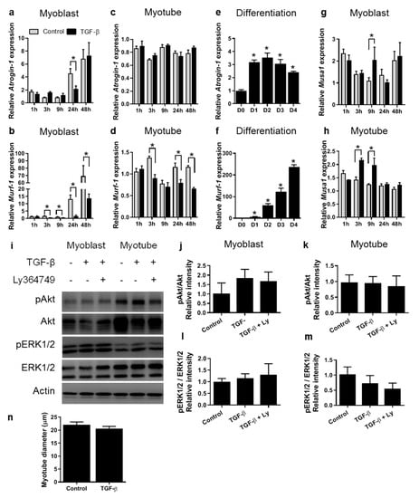 TGF-β does not affect myotube size. (a,b) In myoblasts, relative expression levels of Atrogin-1 (a) and Murf-1 (b) were inhibited by TGF-β. (c,d) In myotubes, Atrogin-1 (c) expression was unaffected by TGF-β, while Murf-1 (d) expression levels were inhibited after 3, 24 and 48 h. (e,f) mRNA expression of Atrogin-1 (e) and Murf-1 (f) increased during differentiation, where D0 is the start of differentiation and D1, 2, 3 and 4 are days 1 to 4 of differentiation. (g,h) In both myoblasts (g) and myotubes (h), TGF-β transiently increased Musa1 expression levels. Gapdh served as housekeeping gene. Data were normalized to values of control cells at 0 h; * indicates significant difference at p < 0.05; n = 3 experiments per condition (a–h). (i,j) Western blot quantification of Akt phosphorylation in myoblasts, (k) Akt phosphorylation in myotubes, (l) ERK1/2 phosphorylation in myoblasts, (m) ERK1/2 phosphorylation in myotubes. Pan actin served as loading control. Phosphorylation levels are displayed as relative intensity of phospho/total protein. Data were normalized to values of the control condition. Error bars indicate standard error of the mean; n = 4 experiments per condition. n After 3 days of TGF-β treatment, the myotube diameters displayed in Figure 1a were not significantly different from those of control condition. n = 80 per experimental condition.